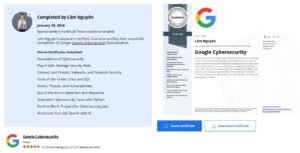 Tôi vừa hoàn thành Google Cybersecurity Certificate sau thời gian học đều đặn. Đây không phải là khóa học “xem cho biết”, mà là một lộ trình có chủ đích, dành cho những ai thật sự muốn hiểu và làm việc với an ninh mạng – đặc biệt là ở vai trò entry-level hoặc người muốn hệ thống lại kiến thức nền.